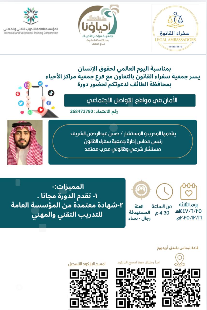 يسر جمعية سفراء القانون بالتعاون مع فرع جمعية مراكز الأحياء بمحافظة الطائف بالشراكة دعوتكم لحضور دورة تطويرية مجانية بعنوان :