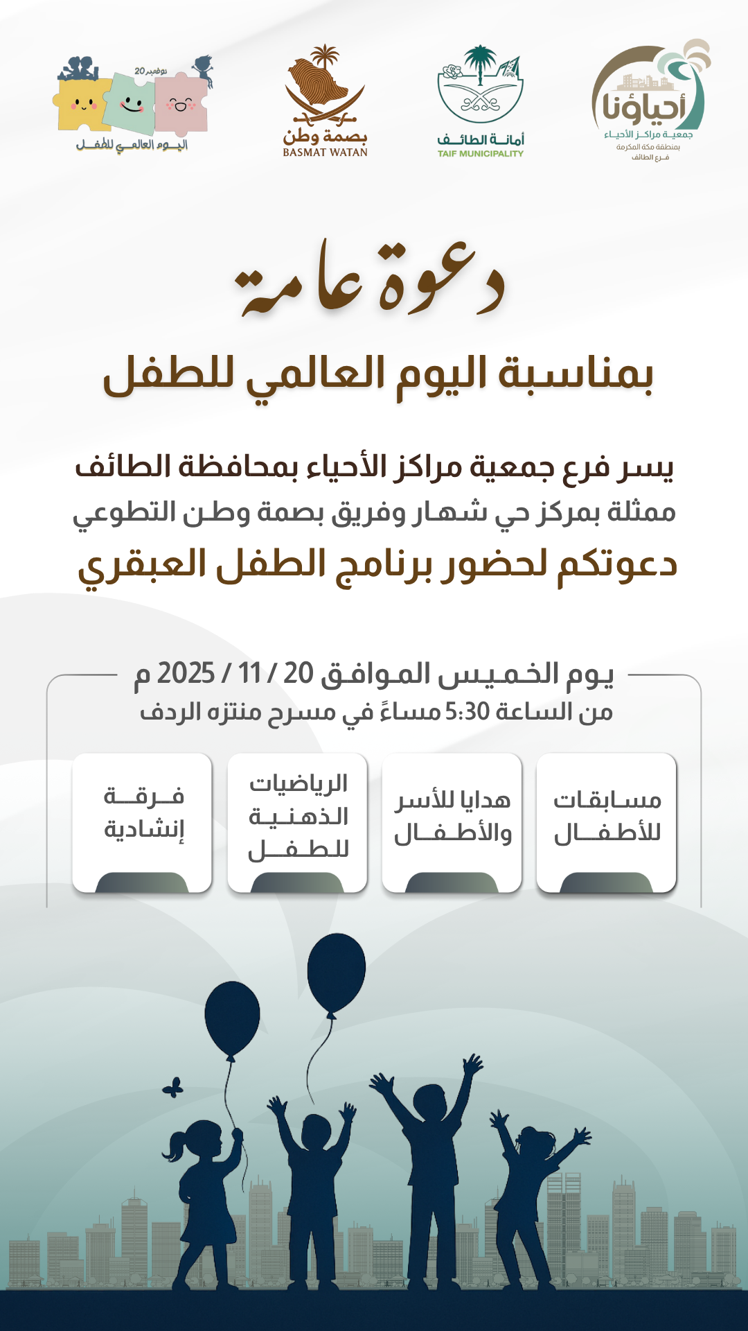 تفعيل برنامج الطفل العبقري بمناسبة اليوم العالمي للطفل وذلك بتفعيل مسرح منتزه الردف بالتعاون مع فريق بصمة وطن التطوعي بتنفيذ (مسابقات للأطفال - هدايا للأسر والأطفال - الرياصيات الذهنية للطفل - فرقة إنشادية ) .