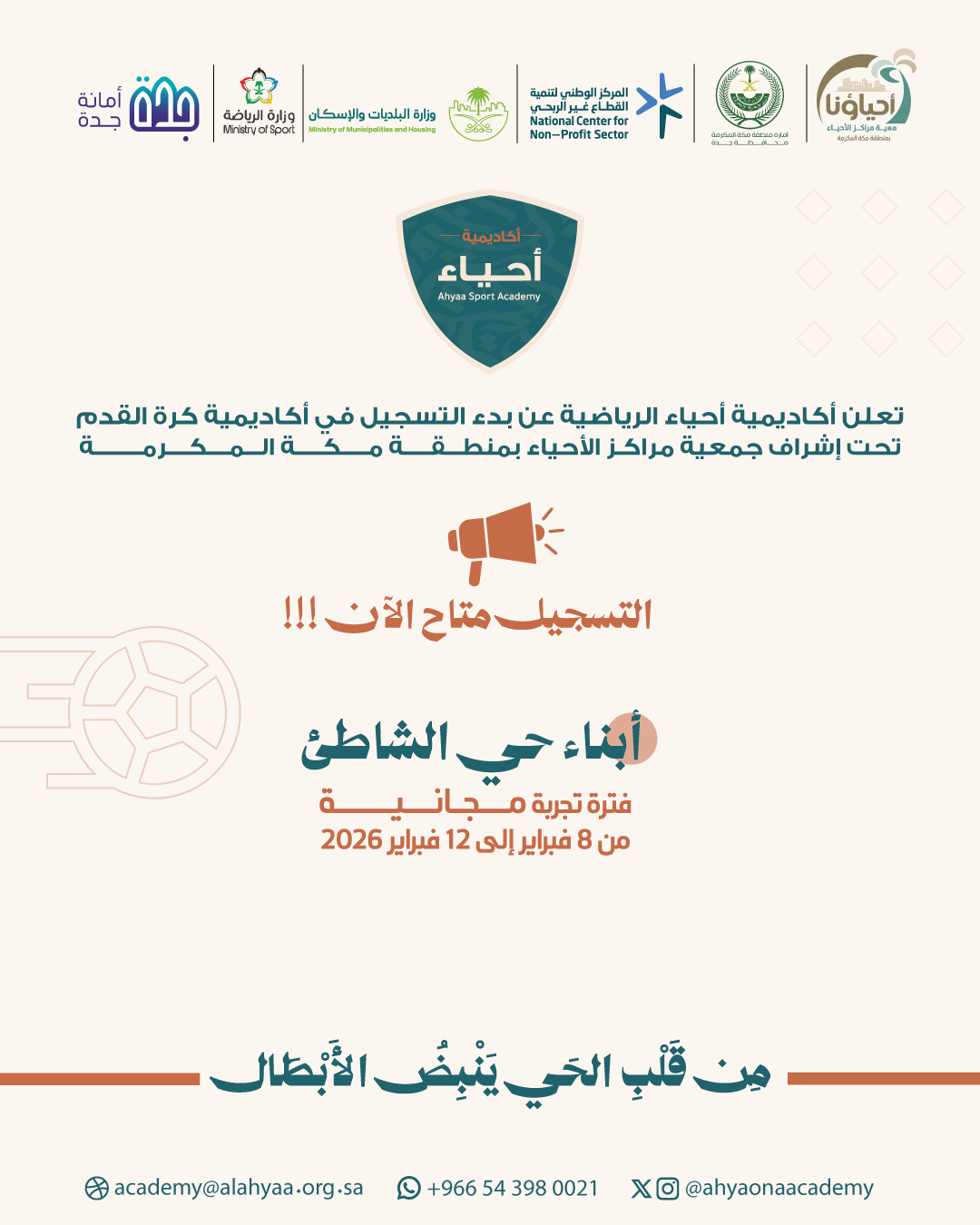 تعلن أكاديمية أحياء الرياضية عن بدء التسجيل في أكاديمية كرة القدم، تحت إشراف جمعية مراكز الأحياء بمنطقة مكة المكرمة